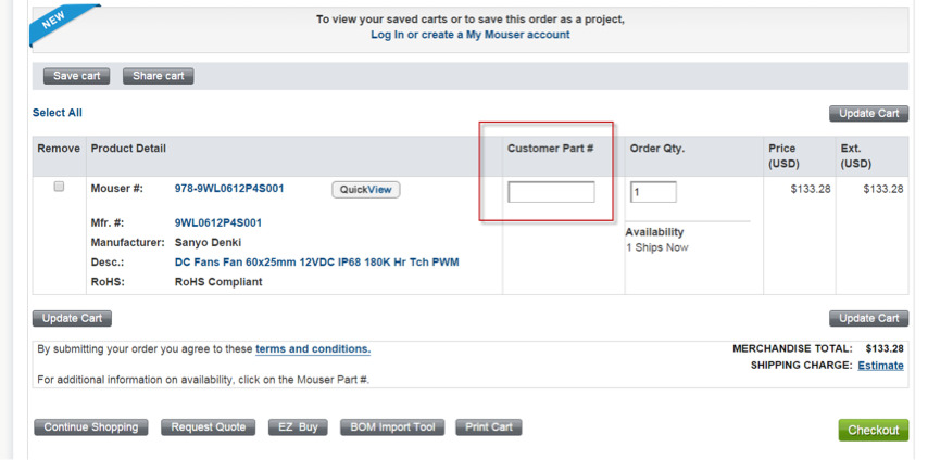 Figure 1B: Shows a cart. If you put a part number in the Customer Part # box, Mouser Electronics will ship that part with a label that matches. This is a nice feature to quickly sort out parts for schematics.